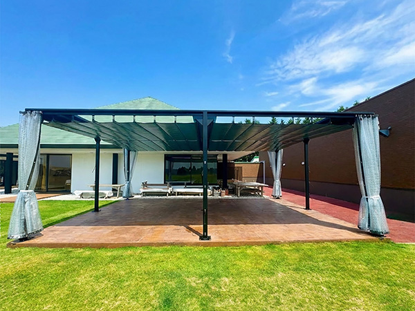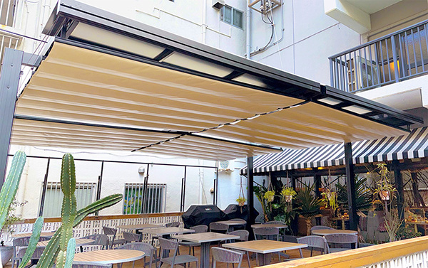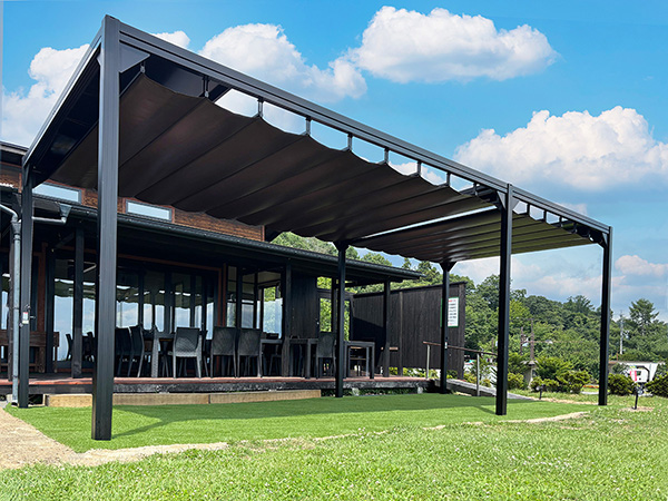 従来のラインナップよりもさらに大型化し、1基で25平方メートルの屋根空間を創出。柱の本数を抑えつつ、ゆとりのあるテラス席やイベントスペースを確保できます。