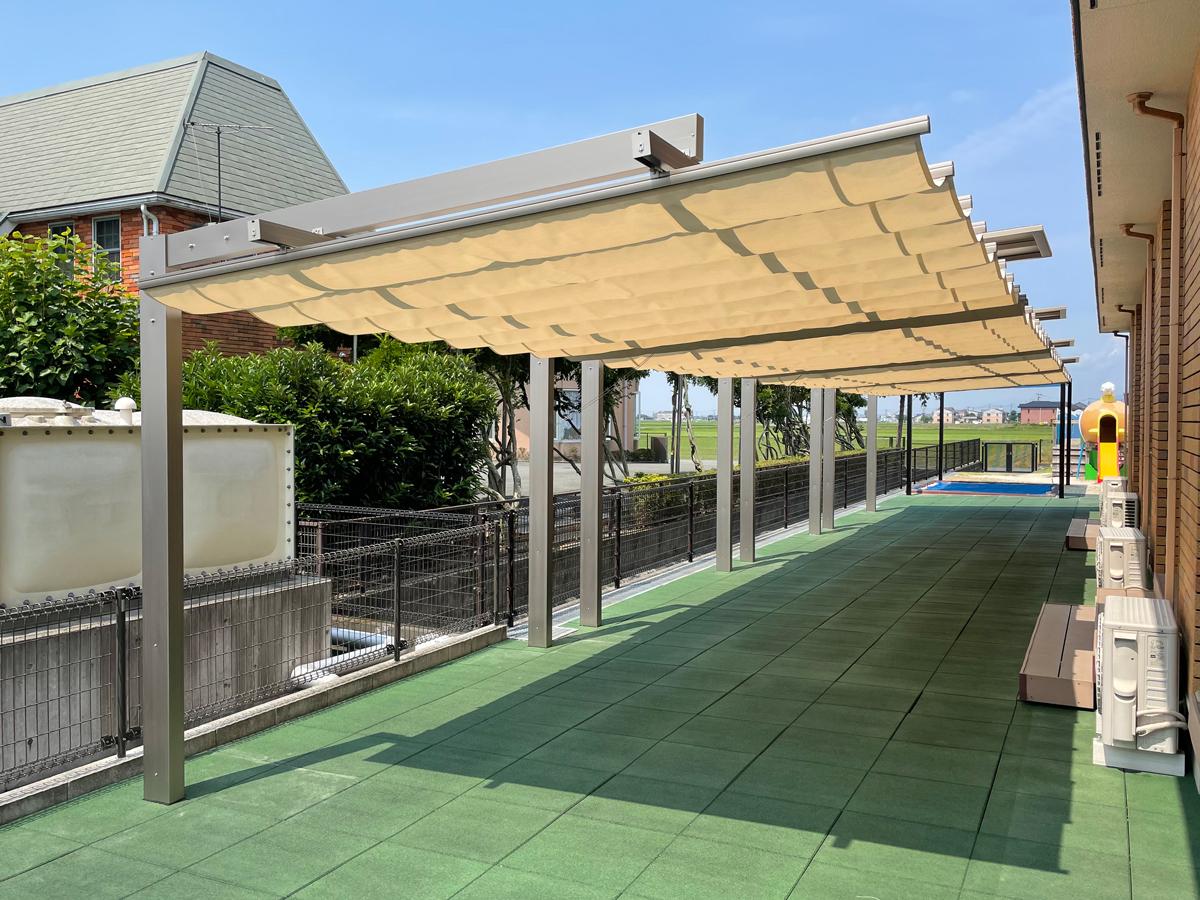 緩やかな波型デザインが園庭の景観に調和し、暑い日差しを遮断。
