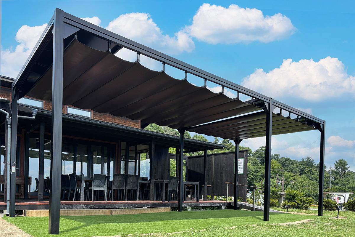 今回、そのテラス席にタカノのオーニング「リパーロ」を設置いただきました。既存のテラス席を増設する際の日よけとして、テラスに合わせた連棟仕様で施工しています。