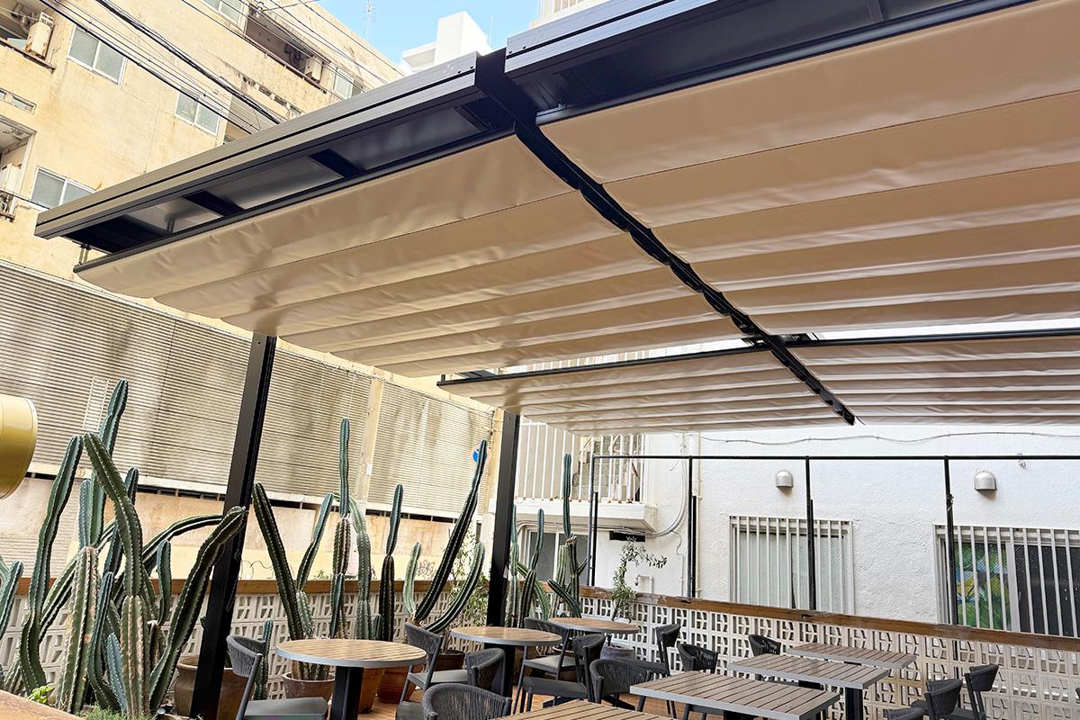 今回はロビーラウンジに隣接するテラスへ、超大型パーゴラオーニング「リパーロ グランデ」を導入しました。中間に柱を設けない構造のため、テラス全体を見通せる開放的なスペースを確保。テラス席は宿泊者以外も利用でき、朝は朝日を浴びながらの朝食、夜は沖縄らしい夜風を感じながらくつろいでいただけます。