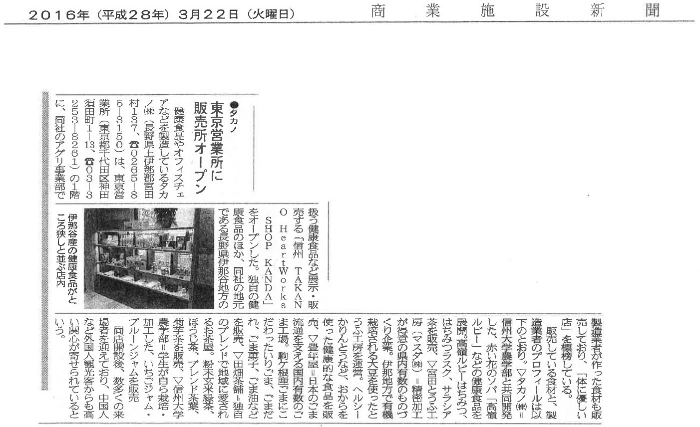 「信州 TAKANO Heart Works SHOP KANDA」についての様子が掲載されました。